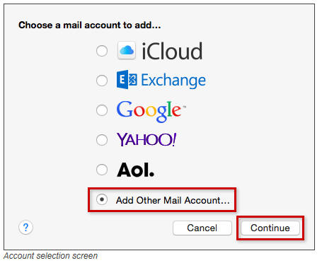 Choose 'Add Other Mail Account...', and click Continue: