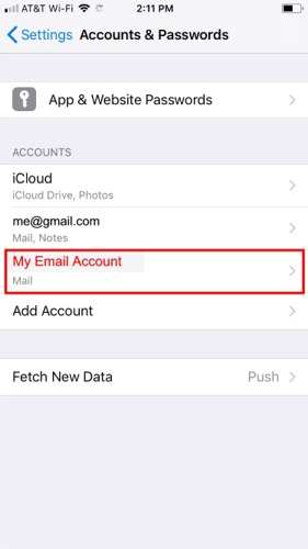 Step 2. Once in Accounts & Passwords, find your email account on the list, and click on it:
