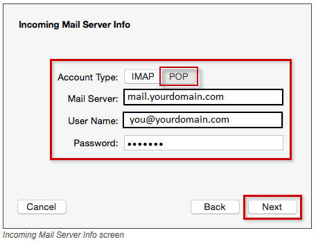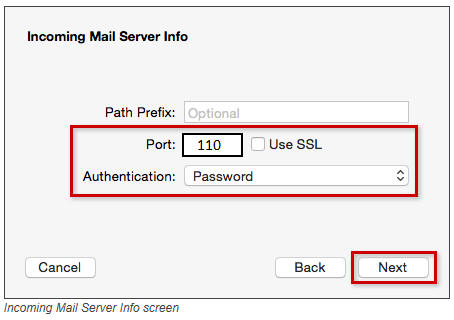 Step 6. Supply the additional Incoming Mail Server Info using the table below as a guide. Click the Next button when finished.