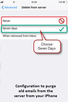 If you ONLY use your iPhone to send & receive mail on this account (not your desktop computer), then you need to configure your iPhone to delete messages after they are downloaded to your phone.  To do this, follow these steps after completing steps 1 - 10 above: